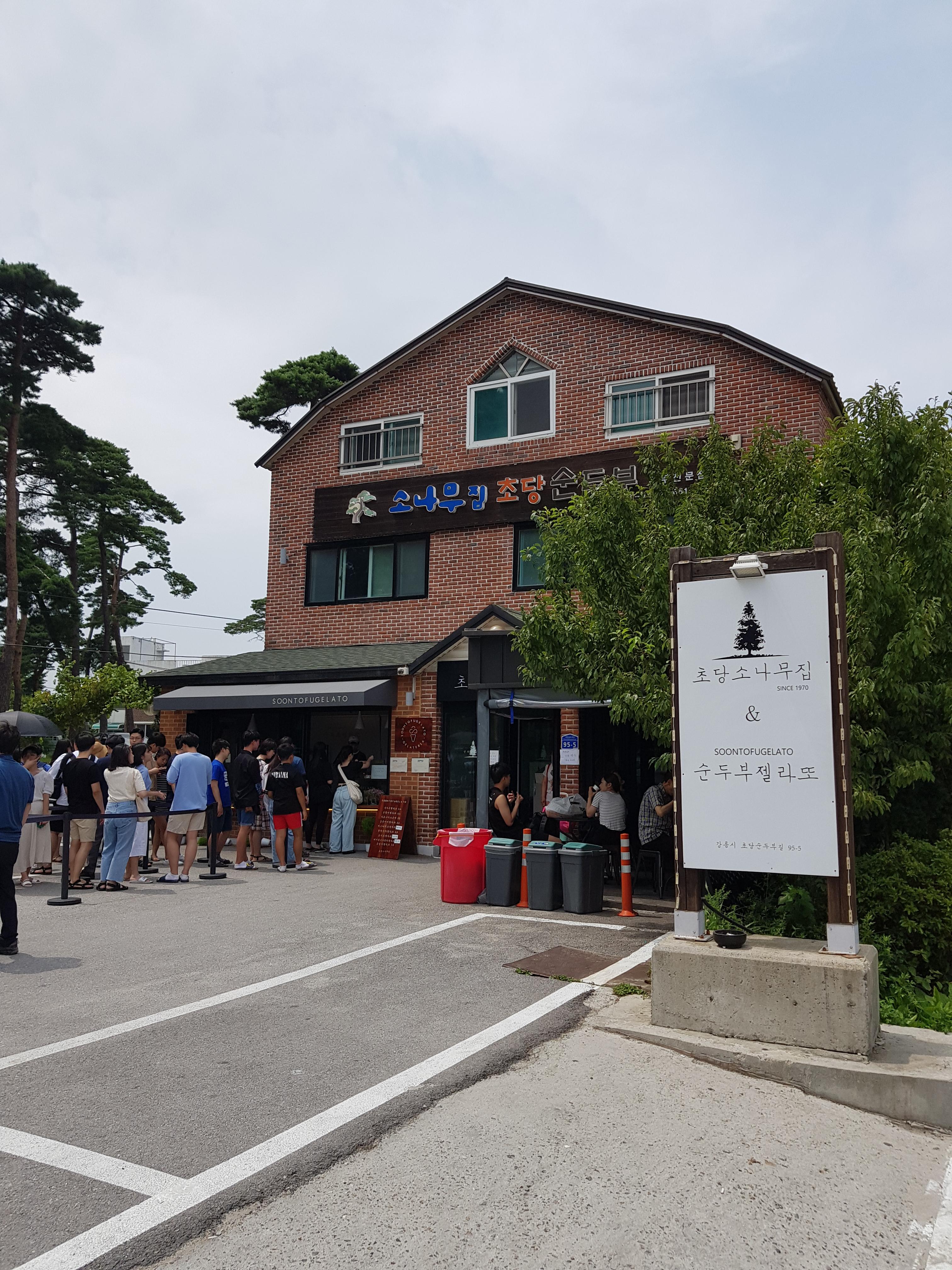 (주차장은 매우 넓으며, 바로 앞에 초당순두부마을이 있고, 그 집 1층이 순두부 젤라또를 파는 곳이다.)