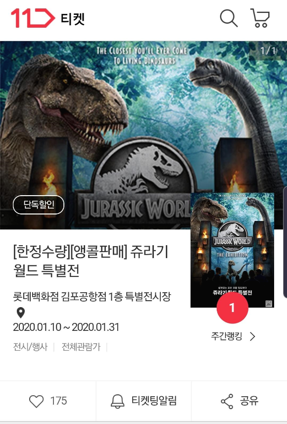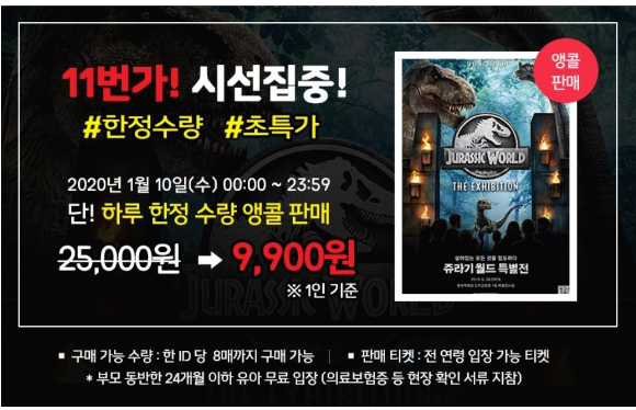 헐 ㅋㅋ 얼마전 T데이 1월 혜택을 통해 "쥬라기월드 특별전" 1+1쿠폰 혜택을 포스팅했었는데, 11번가에서 9,900원 특별 할인 이벤트를 진행중이다. ㅋㅋ 바로 구입!!