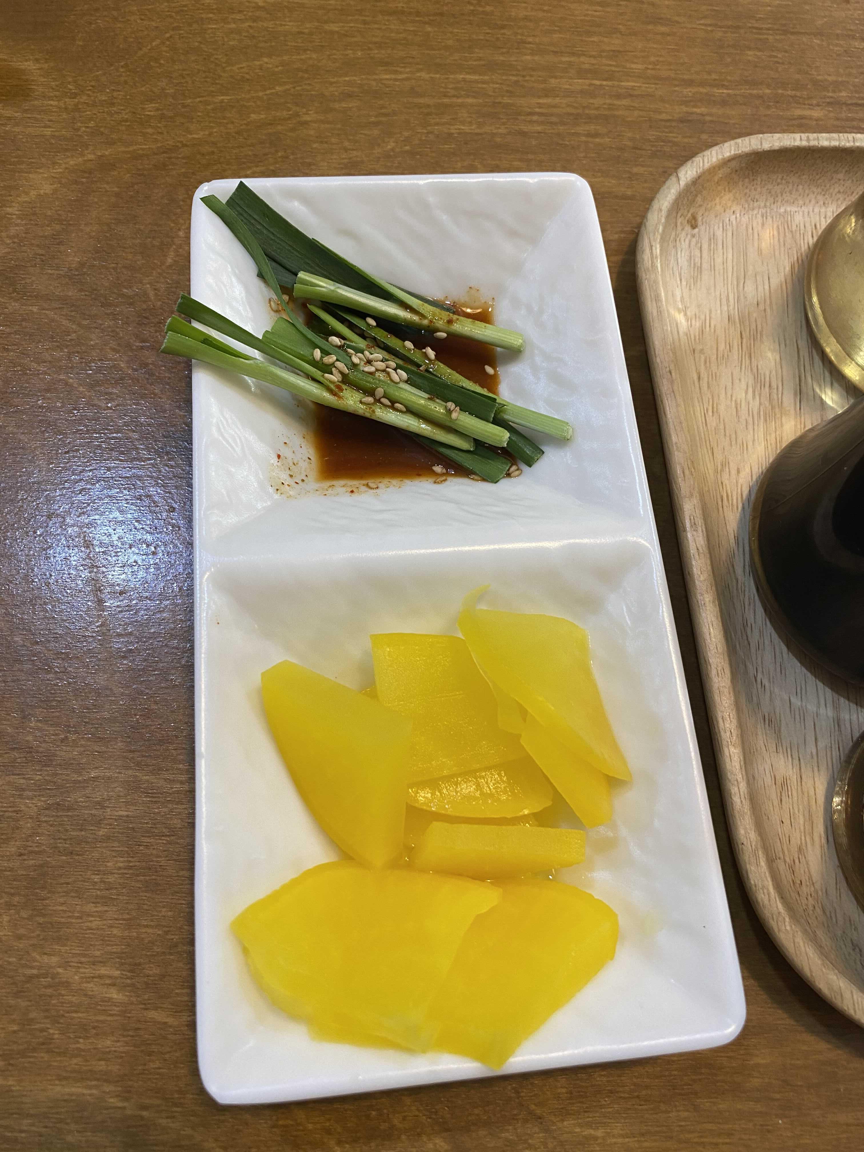 식사를 주문하니 단무지와 부추반찬이 나왔다.