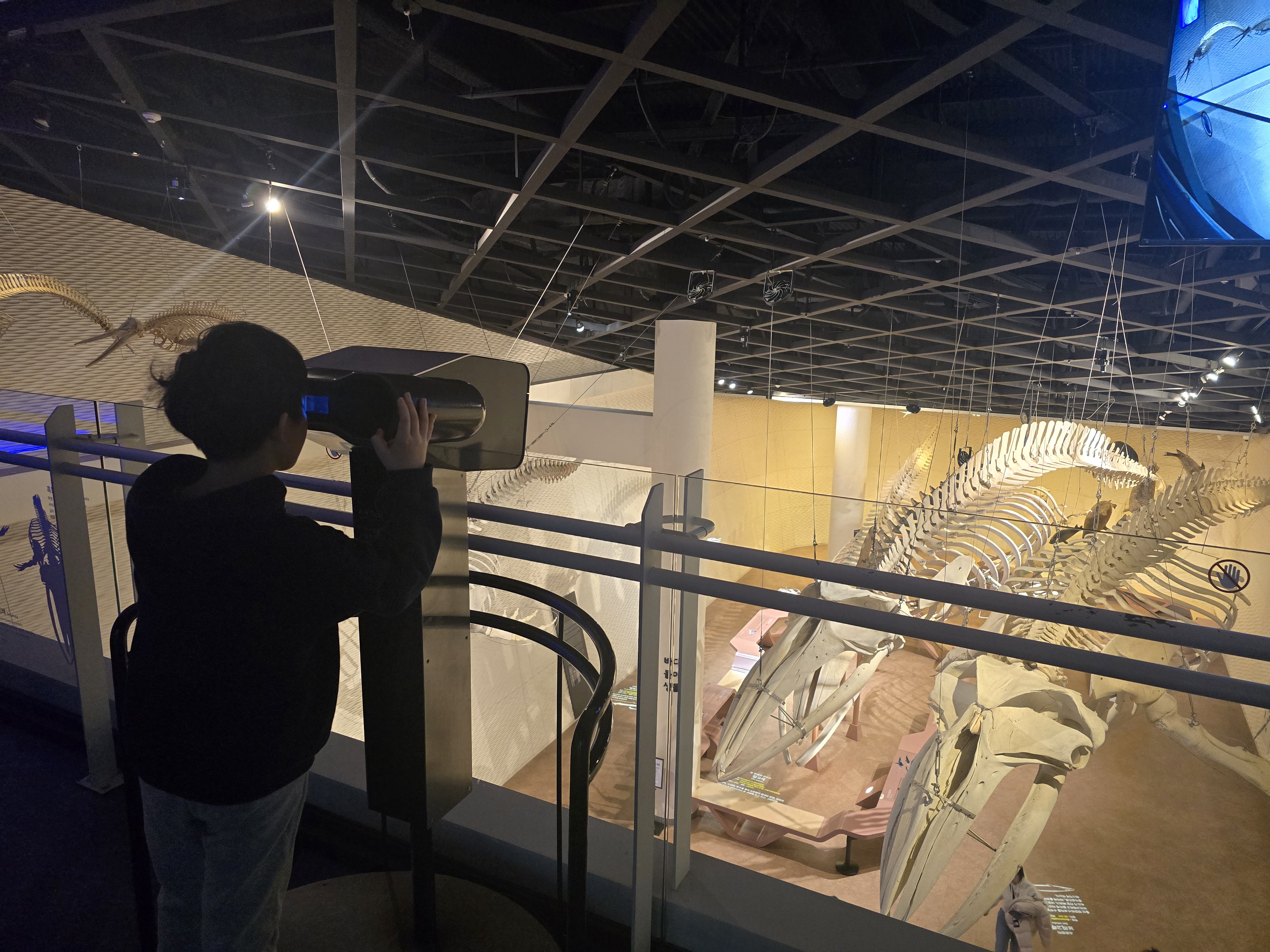 전시된 고래의 뼈를 저 망원경으로 비춰보면 고래의 장기부터 근육, 피부가 재생되어 살아있는 고래가 나타난다.
