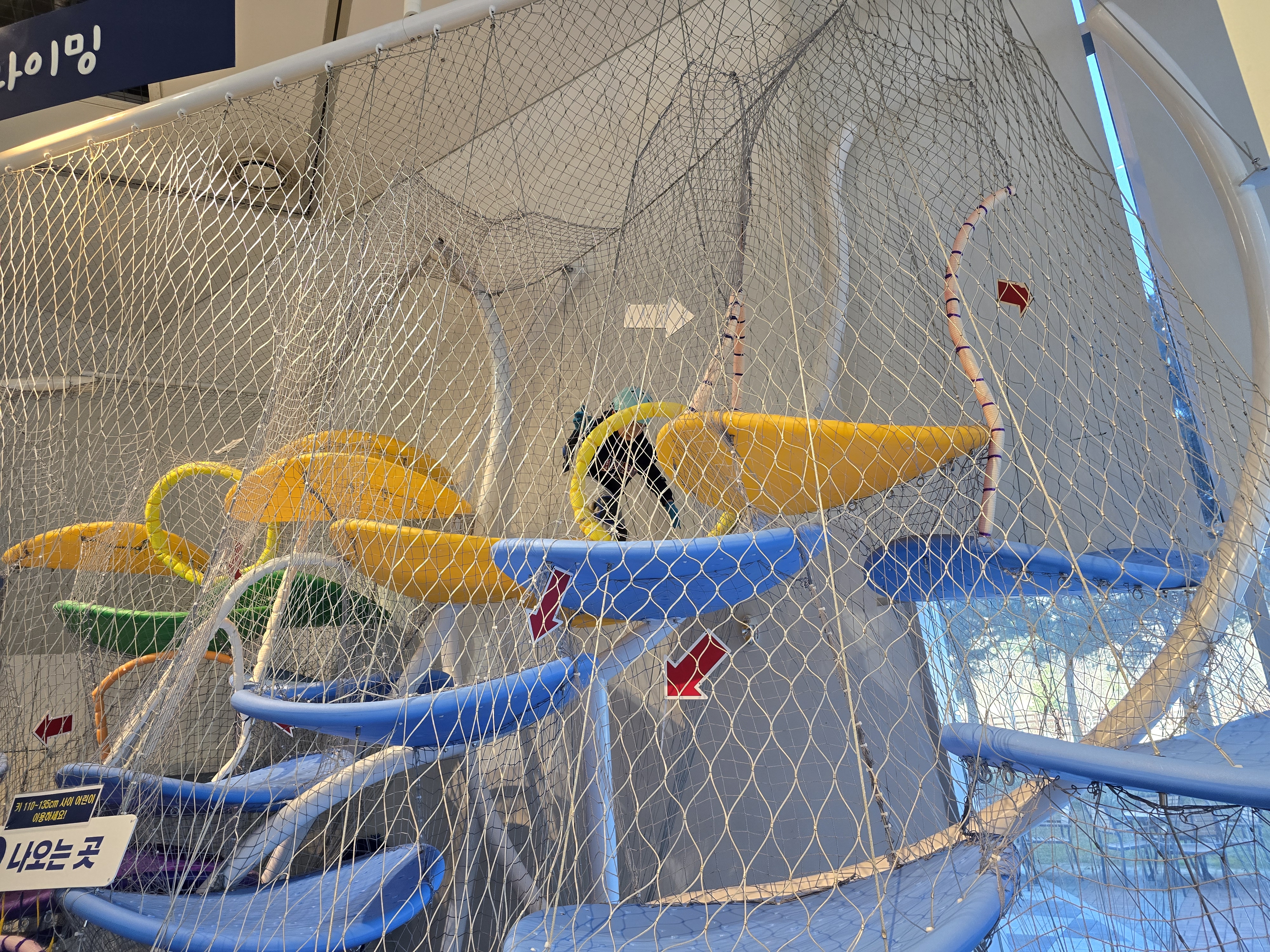 1층에는 작지만 아주 알찬 실내 놀이터가 있다. 보호구를 착용한 후 클라이밍, 볼풀장, 3층 높이의 미끄럼틀 등!