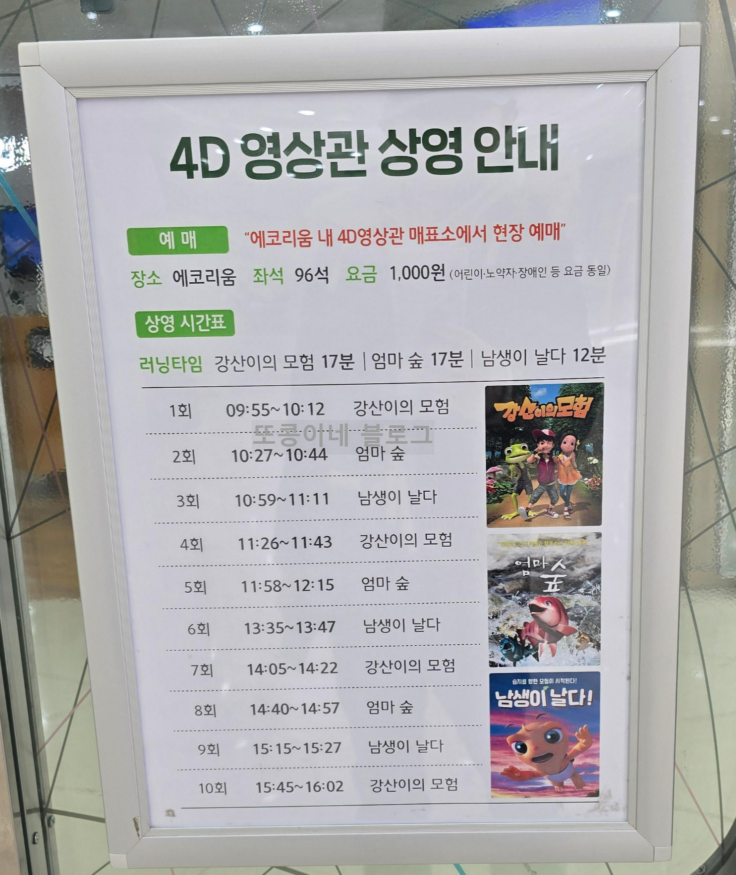애들을 일단 4D입체영상관에 넣어 놓고 엄빠는 커피 한잔 ㅎㅎ 영상시간표는 사진 참고.