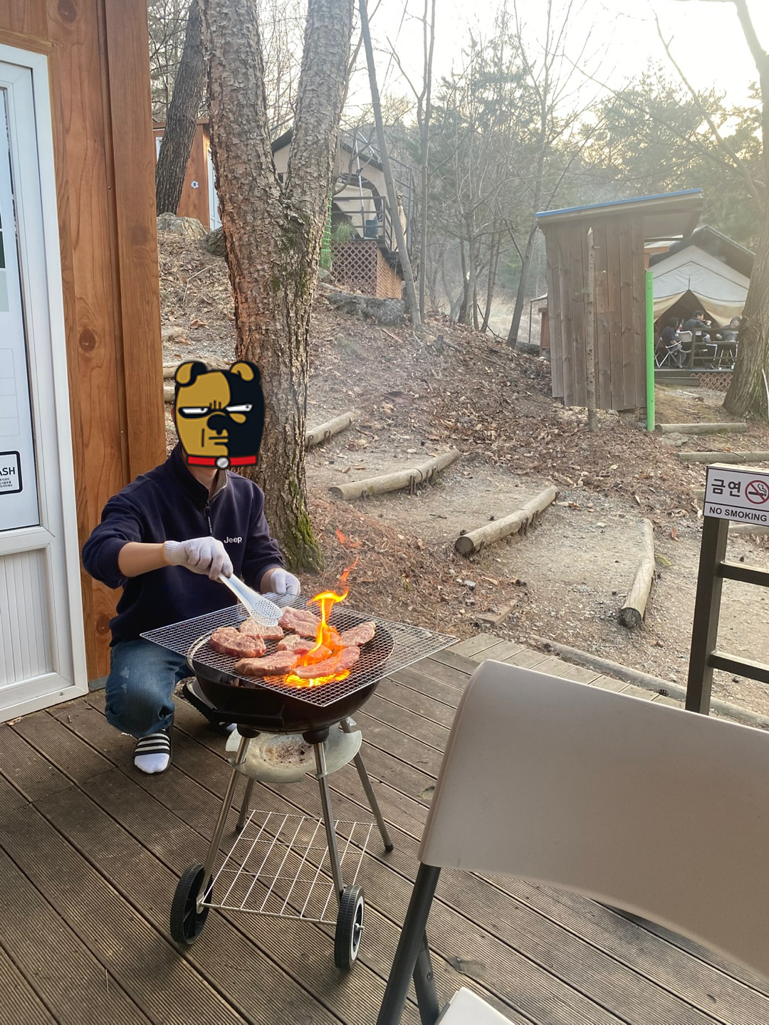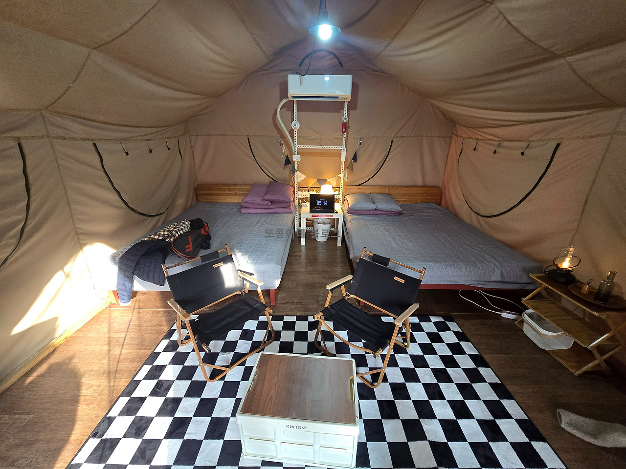 좌측 침대위의 외투만 빼고는 모두 글램핑 내부에 구비된 물품들이다. 가운데 패드같은 것은 티비이다!! 작은 의자도 테이블도 구석에 램프 소품들도...진짜 감동이다. 가성비 최고! 데크에도 캠핑의자와 식사테이블, 화로가 있고, 별도의 화장실과 세면을 할 수 있는 샤워시설이 있다.