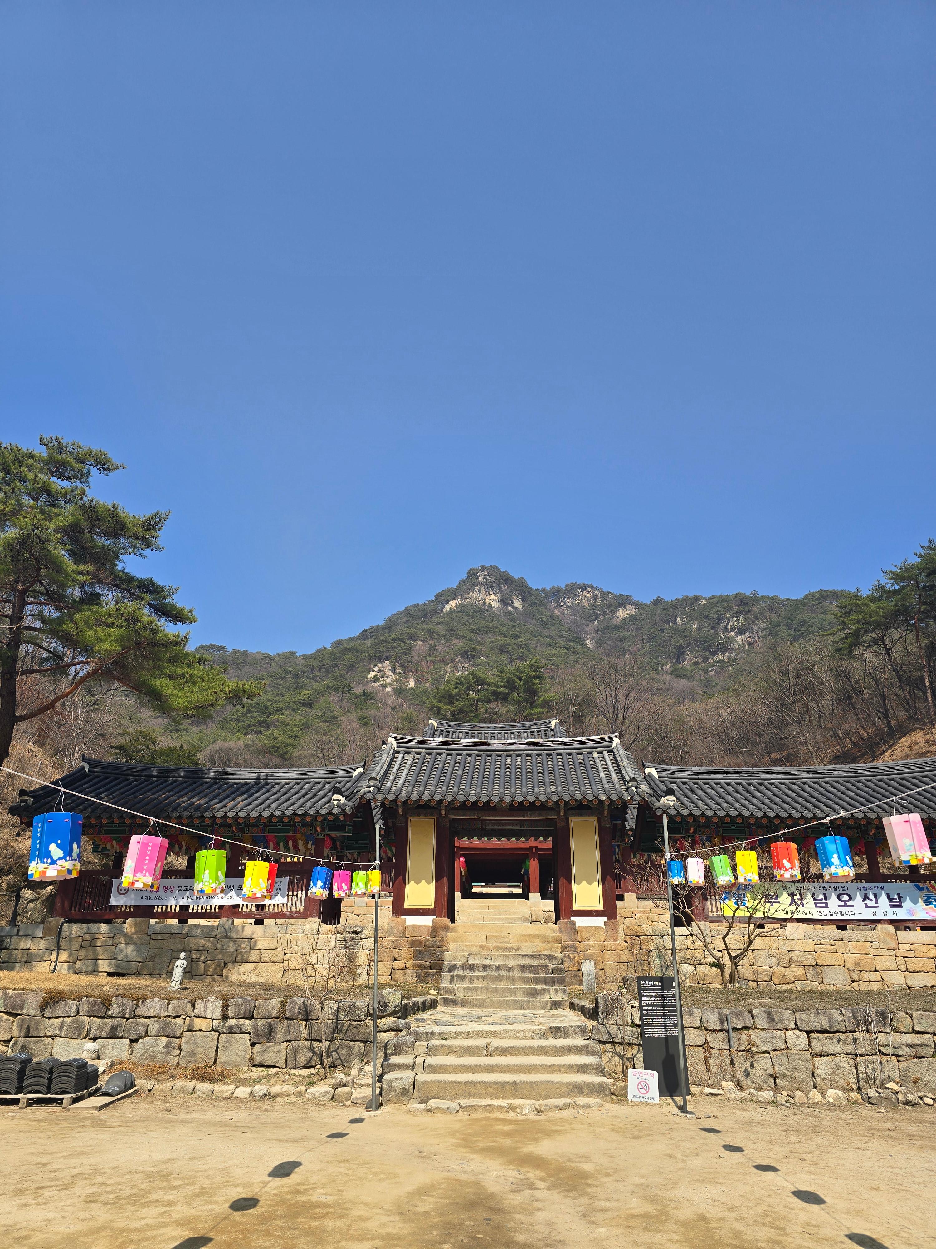 청평사에 도착! 뒤에 산이 정말 멋있는데, 비로봉, 보현봉, 문수봉, 나한봉, 관음봉의 다섯개 봉으로 이어진 오봉산이라고 한다. 열살인 우리 아들과 도보로 30분 정도 걸렸으며, 가는 길이 다 포장되어 있고 경사가 거의 없어 하나도 힘들지 않고, 가는 길에 볼 거리가 많아 심심하지 않다.
