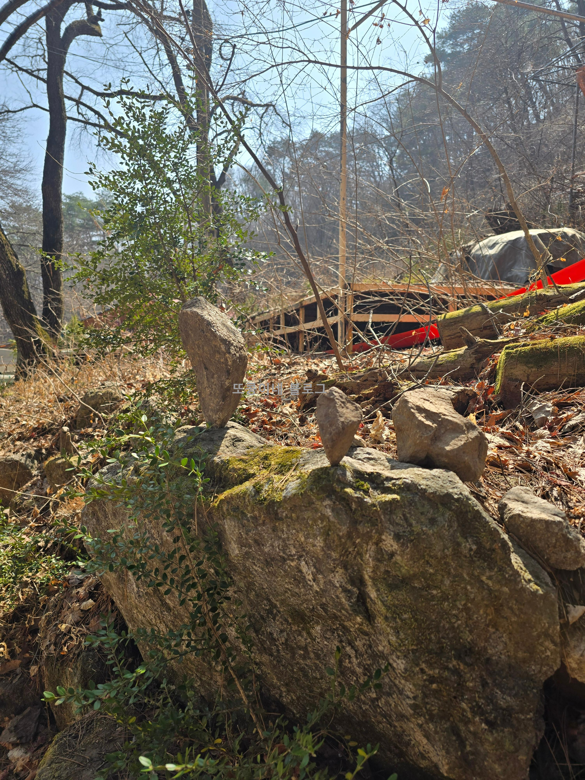 청평사는 주차장으로부터 도보로 30분 정도 걸린다고 한다. 흔들다리를 건너고~ 가는 길에 신기하게 새워진 돌들이 보인다.(흔들다리에서 보면 밑에 유람선이 있는데...유람선을 타고 여기까지도는 것도 가능한다 보다.)