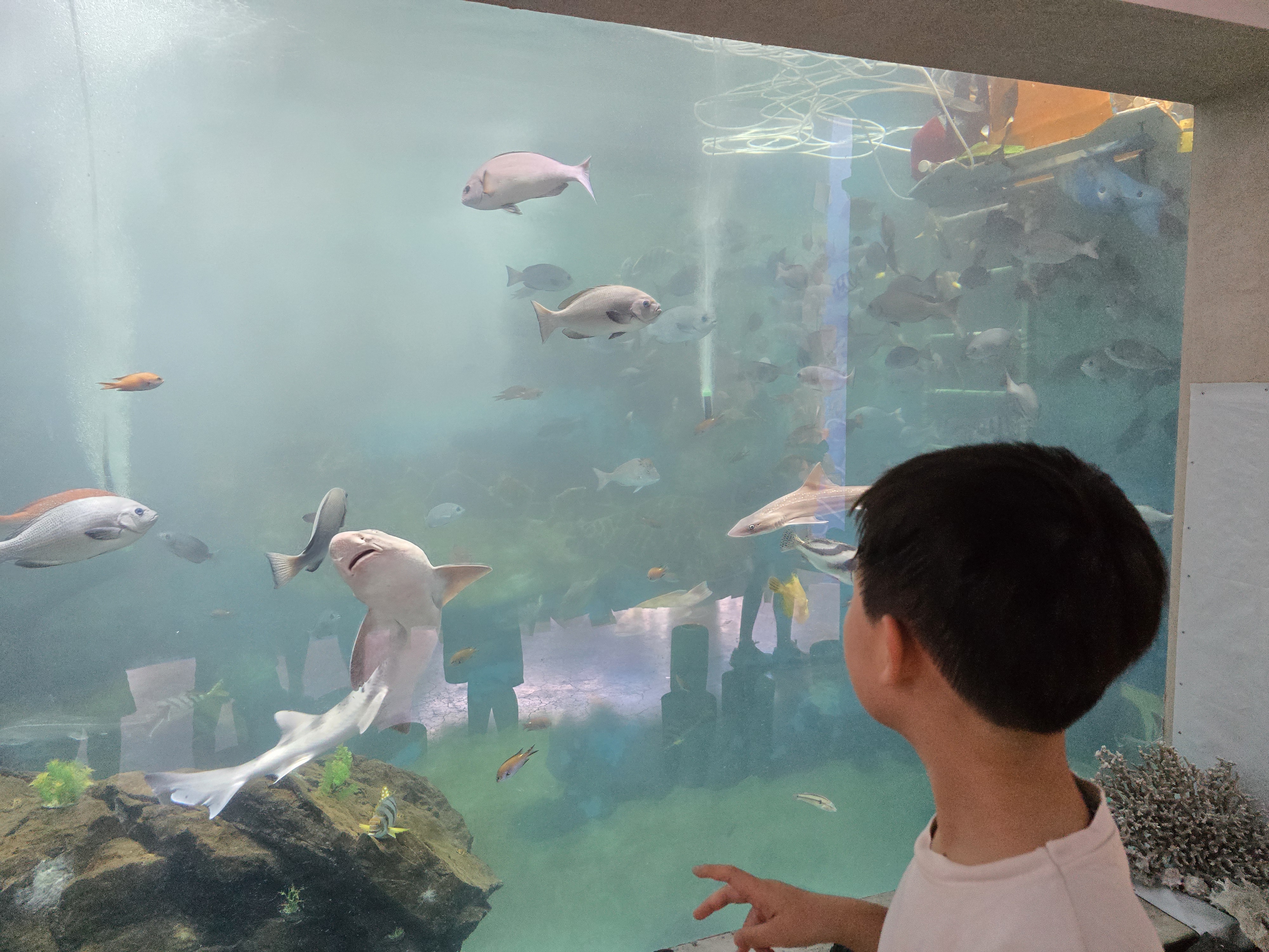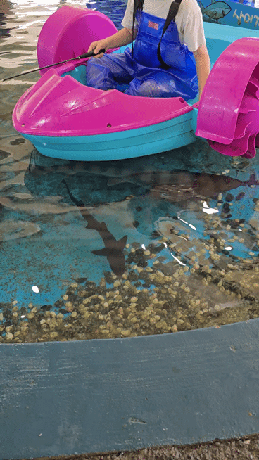 그 옆에 깊고 큰 수조가 있다. 대망의 마지막 수조!!! 바로 상어가 산다. 눈으로 슬쩍 봐도 아이들만한 상어가 유유히 헤엄쳐 다닌다. 물고기 머리 같은 미끼를 낚시대에 달아주는데, 배를타고 낚시를 하다가 상어가 미끼를 물면 상어가 배를 끌고 가는 그런 체험이다. 처음에는 상어가 무서워서 안타겠다고 하다가 나중에는 또 하겠다고 한다 ㅋㅋㅋ