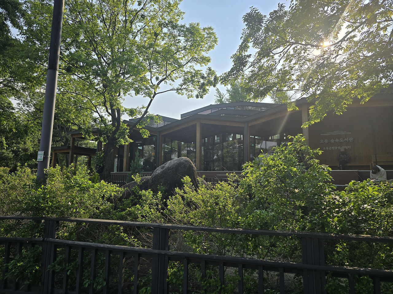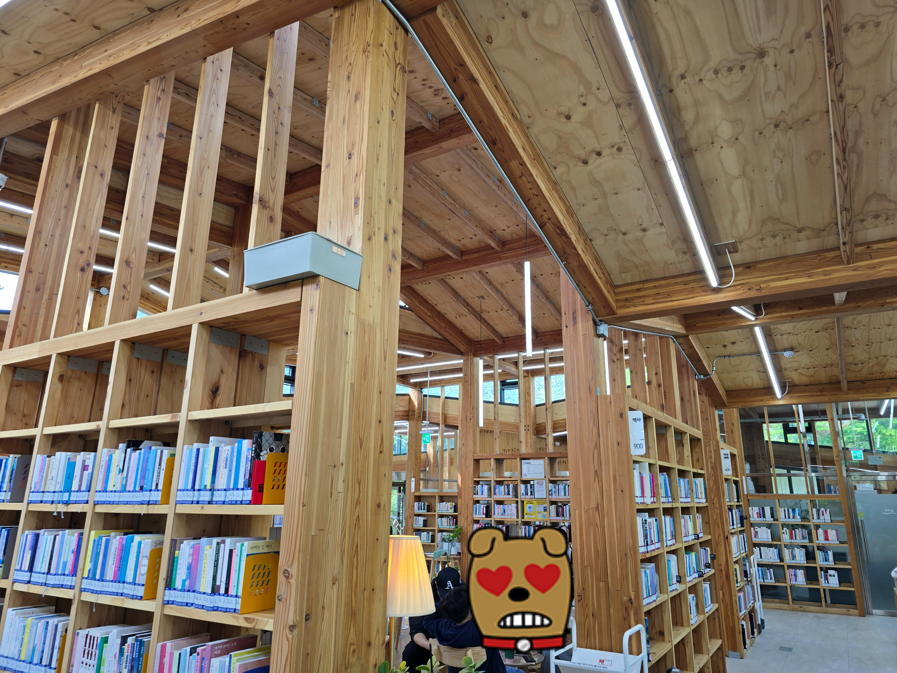 안으로 들어가보면, 도서관이니 관련 많은 행사를 하나보다. 도서관 치고는 조금 작은 규모이나, 책도 적당히 있고 자리도 적당히 있다. 숲속 뷰를 볼 수 있는 창가 자리가 매력적이다. 소파도 푹신! 야외에도 나무 데크에 앉아서 책을 읽을 수 있는 공간이 있다. 근데 책을 가지고 건물 밖으로 나가기 위해서는 대여를 해야 한다.