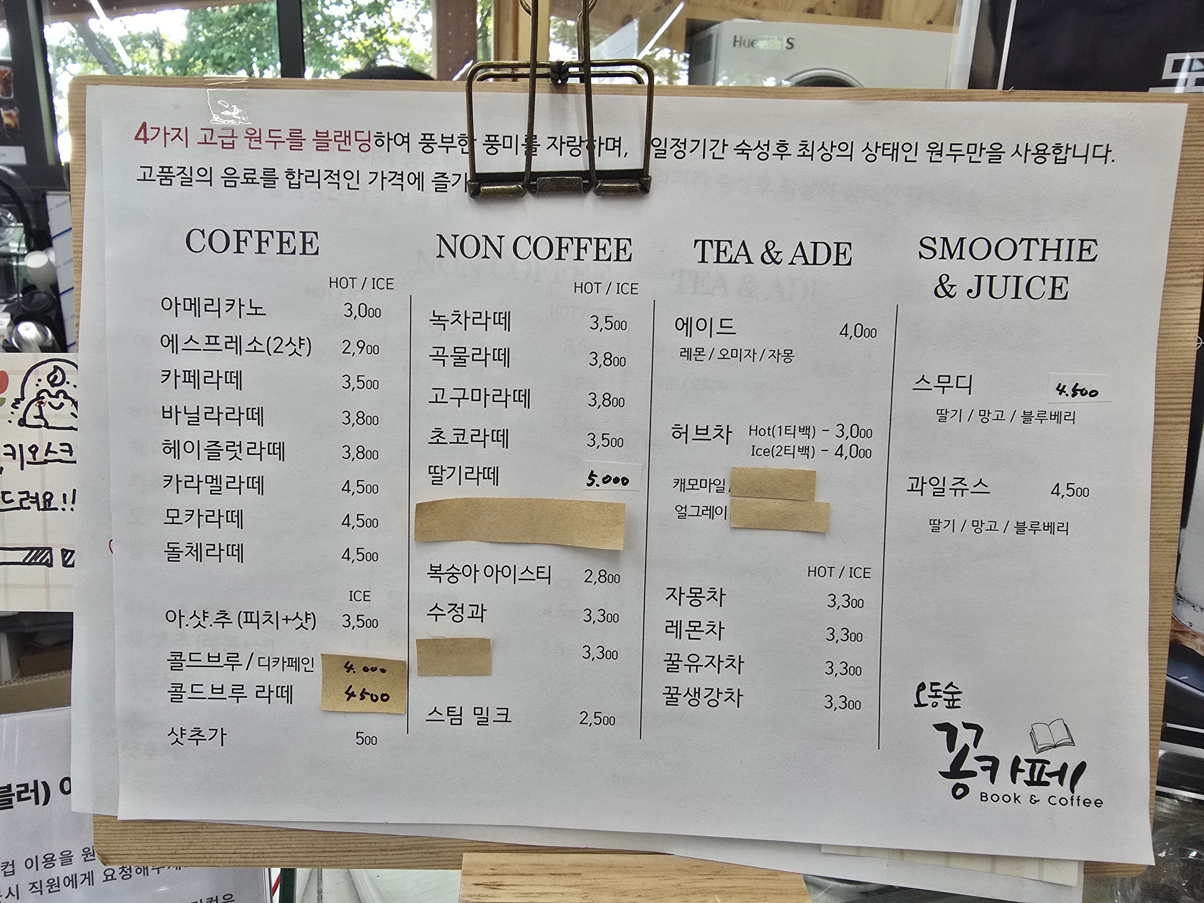 그리고 도서관 안에 커피숍이 있다. "오동숲 꽁카페" 아이들은 망고스무디와 요거트 스무디, 엄마아빠는 아이스 아메리카노와 아이스티!