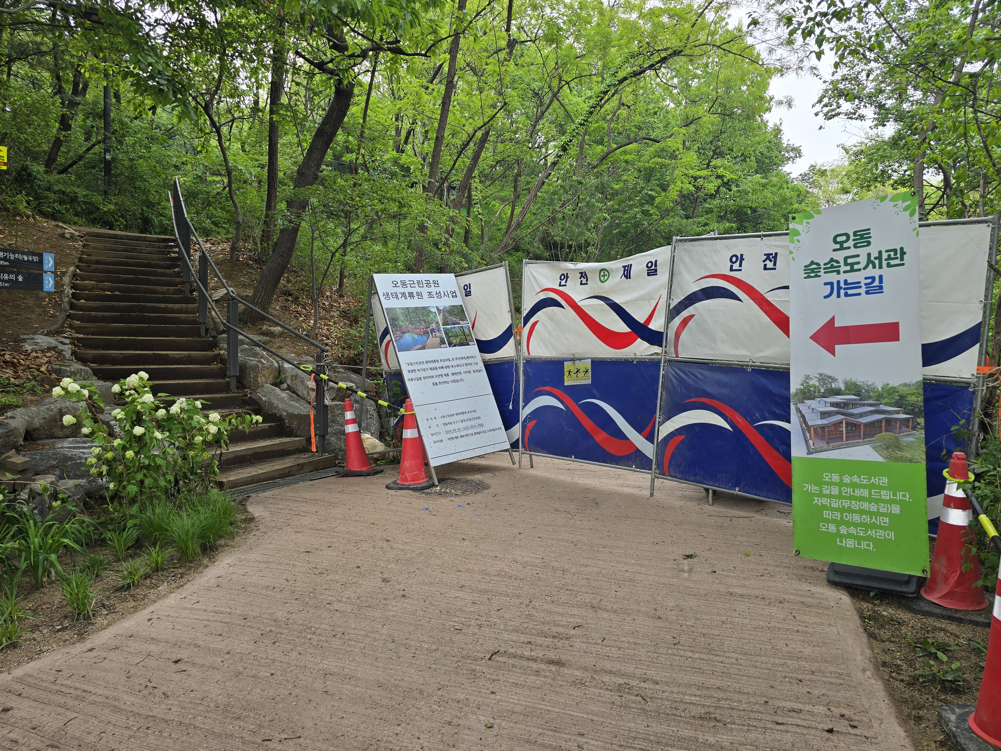 자리는 많은데 주변에 테니스 코트랑 배드민턴 코트가 있어서 그런지 차가 많이 차 있었다. 성북구민체육관에 주차를 하고 우측 위로 난 길을 바라보면, 오동숲속도서관 가는 길을 알려주는 표시가 보인다.(공사 중인데, 저기에 예쁜 연못도 있고 산책길을 조성하고 있었다. 완성되면 다시 와봐야지)
