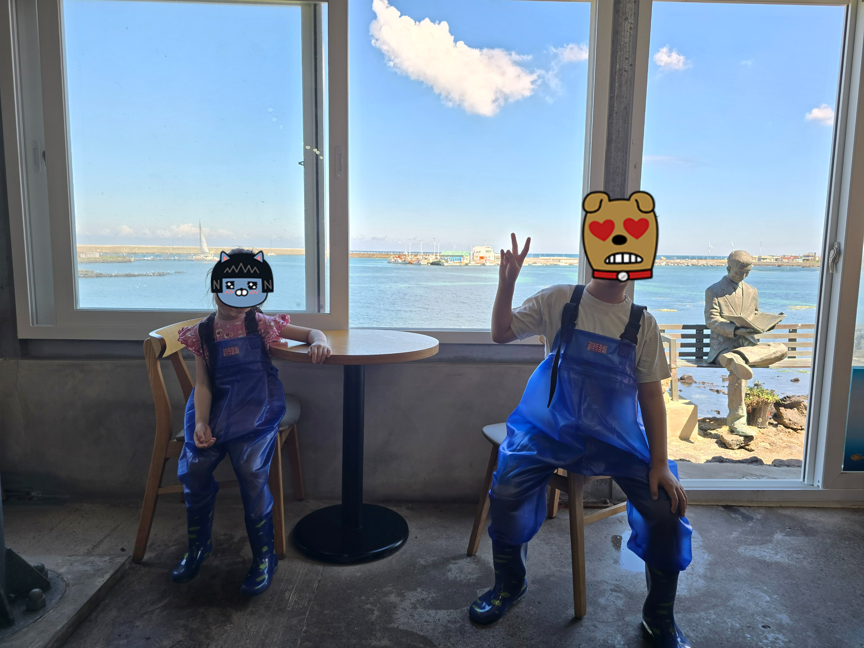 입장하여 우선은 가슴장화로 옷을 갈아 입었다. 처음에는 실내가 좀 작아서 애들이 좋아할까 의문스러웠다. (바닷가랑 맛대고 있어 사진이 잘 나온다.)