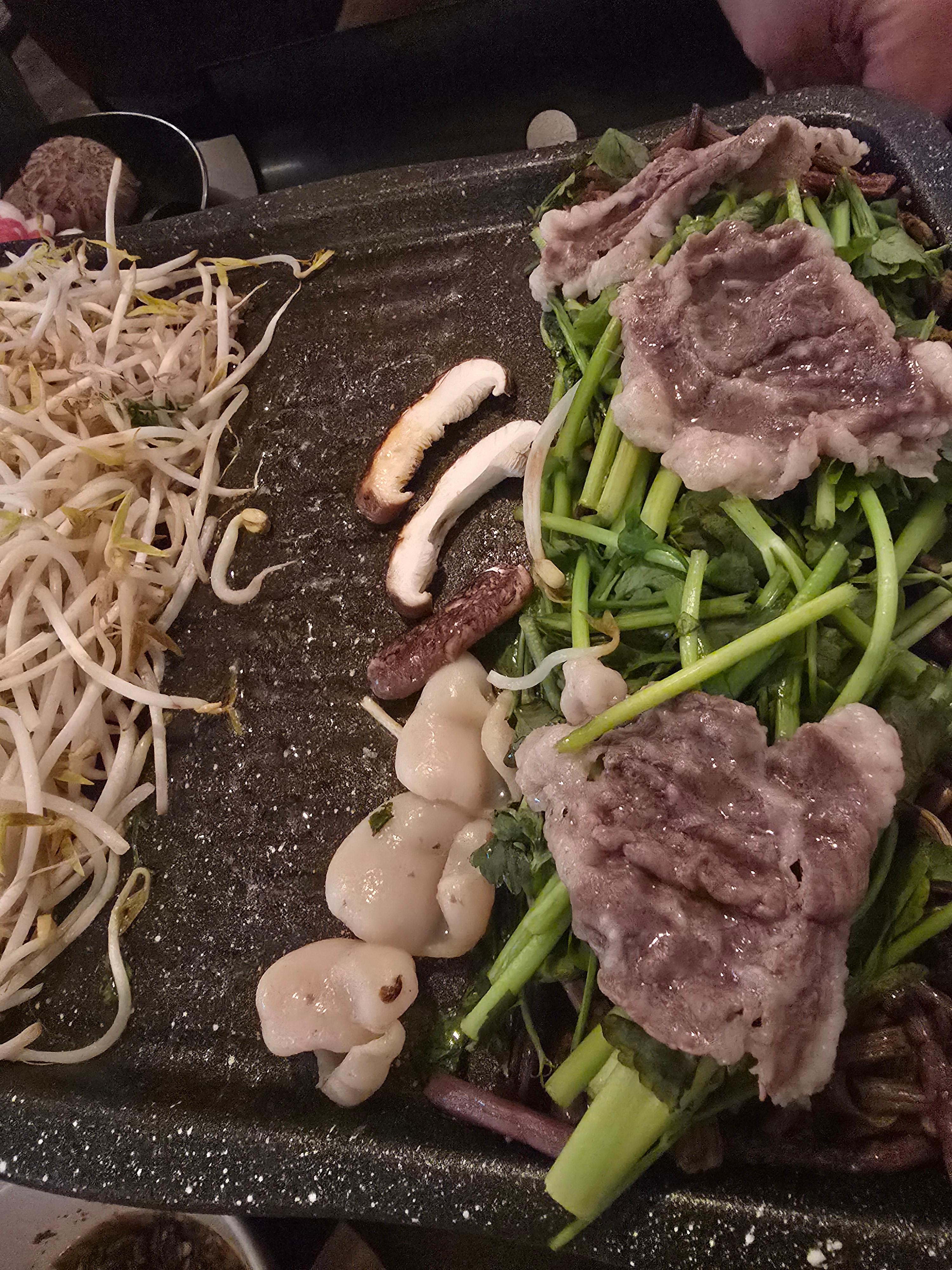 돌판이 달궈지고, 숙주, 미나리, 고사리의 숨이 좀 죽으면, 진짜 주인공 삼합이 등장한다. 차돌과 관자와 표고버섯.