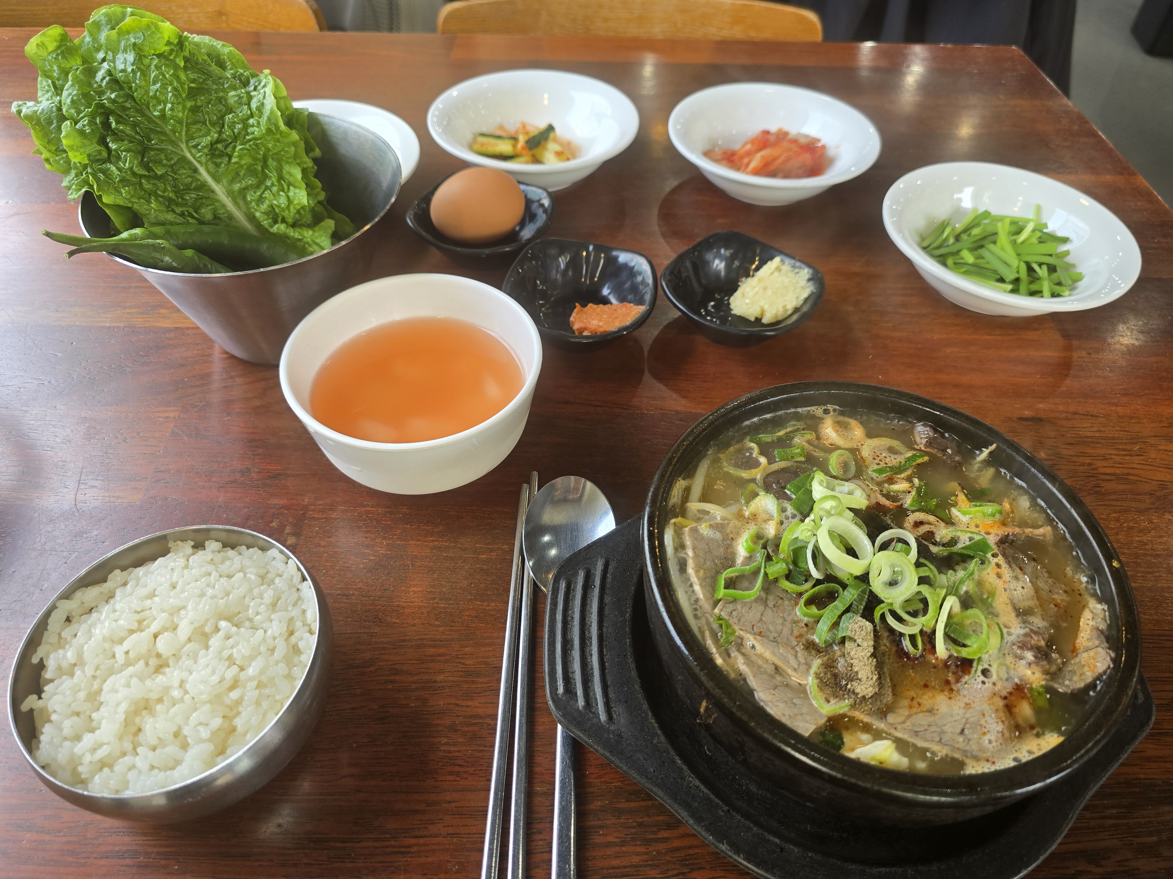주문한지 얼마 안되어 해장국이 나왔다. 크으~ 역시 본고장이 다르다. 시원한 물깍두기와 날계란!!!!! 서울에서는 아무리 제주도식 해장국을 따라한다하여도 이 두개를 제공하는 곳은 보지 못했다. 팔팔 끓는 뚝배기에 다진마늘과 날계란, 그리고 취향에 따라 부추까지 풀어 넣는다. 순식간에 한 그릇을 뚝딱 비웠다.